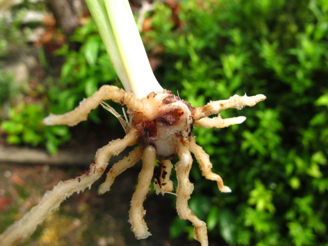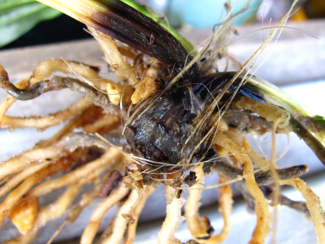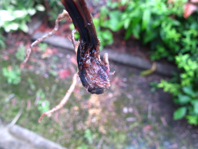 発生源の親木のバルブを切ってみたところ:中まで完全に黒褐色に腐っていました。