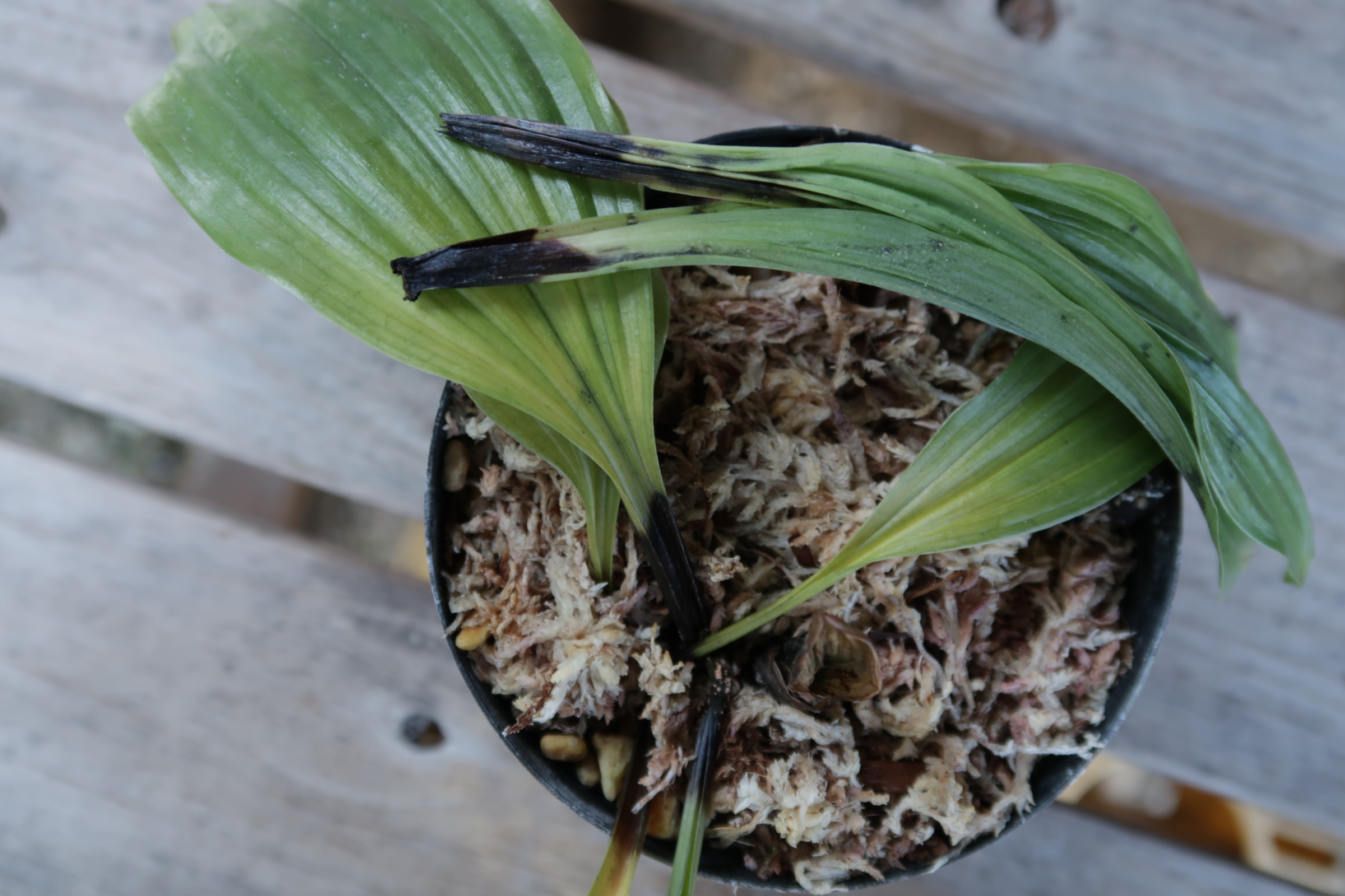 日照少なめの隅の方に置いていたので気づきませんでしたが、完全に手おくれで前年の葉元も腐ってグラグラ。新芽がズボッと抜けました。古いバルブもダメ。ナンマイダ~~~チ~ンです。