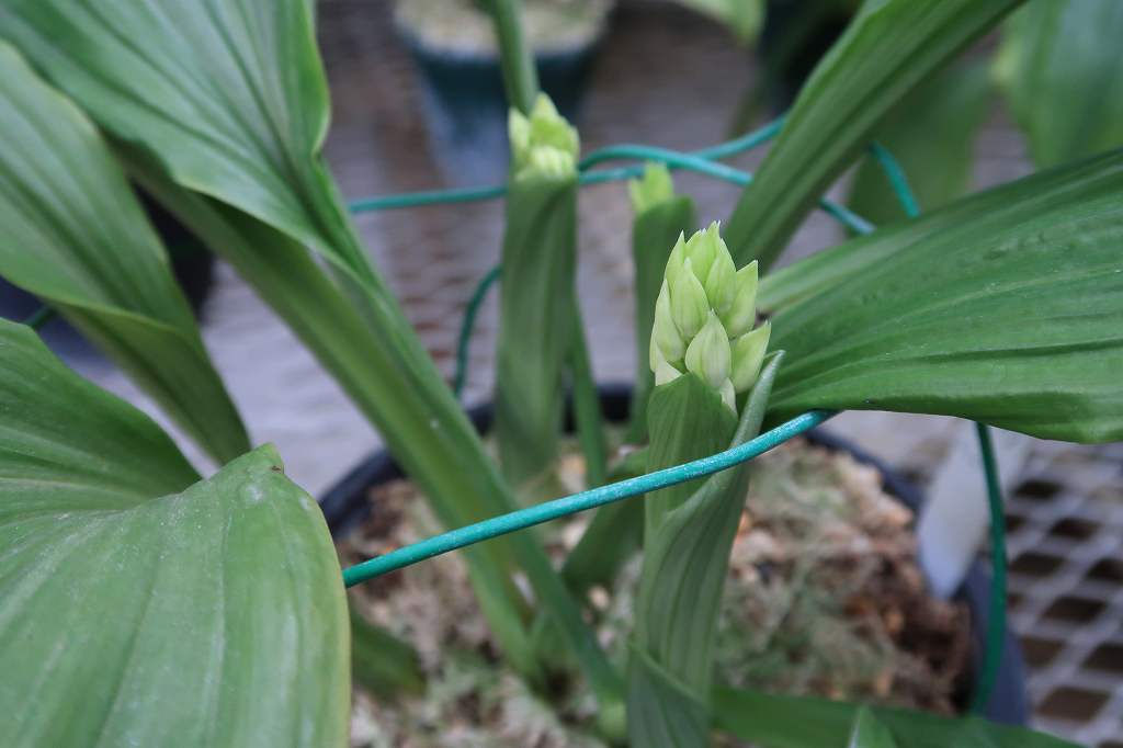 ニオイ系コオズ交配種 一番伸びている蕾。自家交配株で播種後7年目ようやく開花・・・