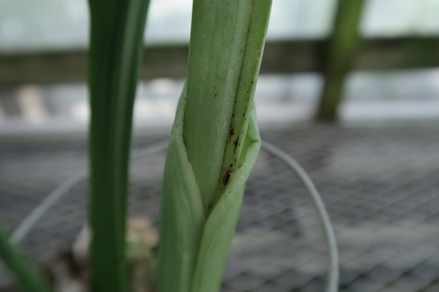 この株も新芽は大きいが葉鞘が徒長して20cmくらいに伸びている。花は?