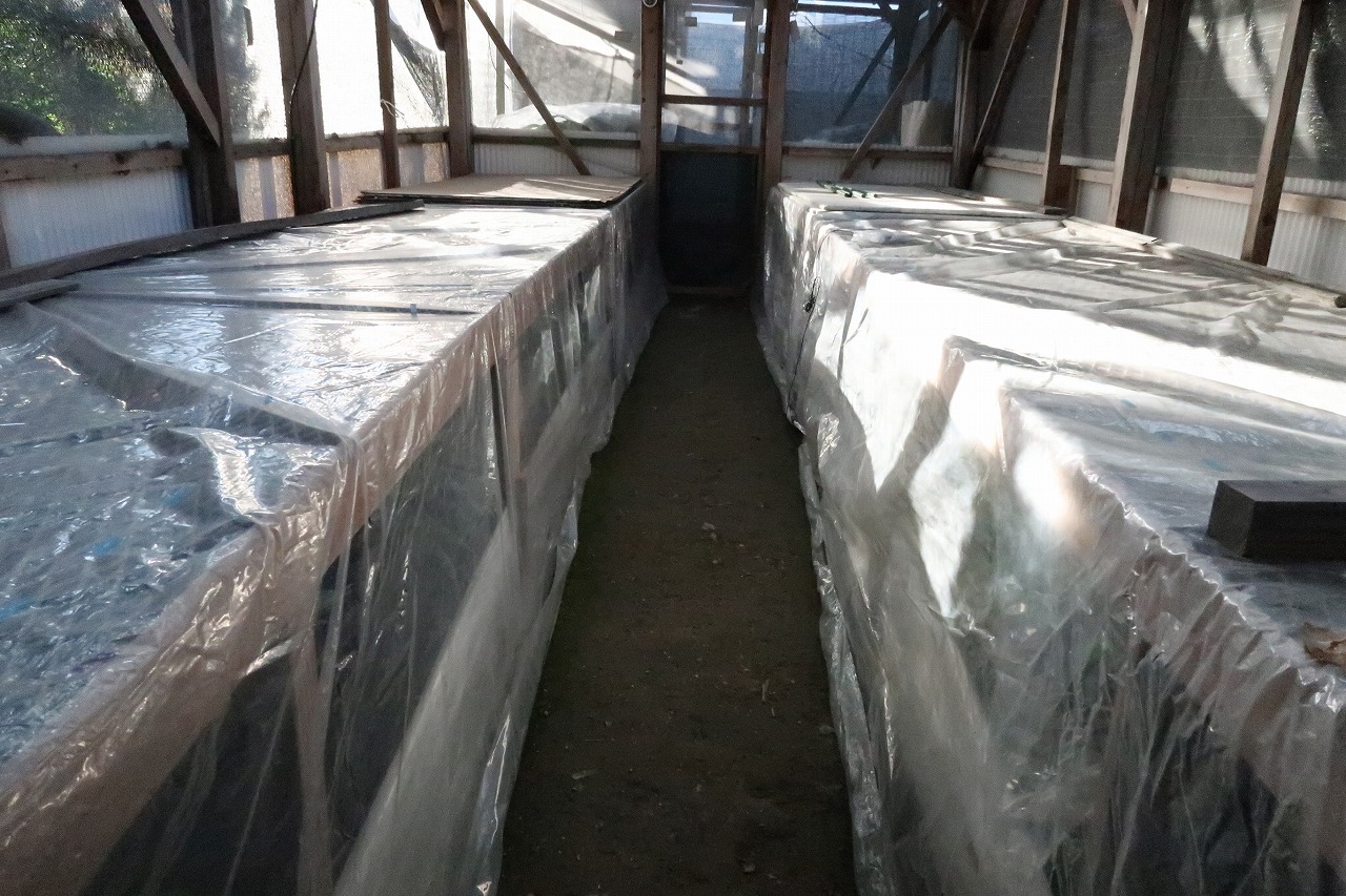 小屋の向こう側にも越冬の置き場があり、不織布で風よけをしているが外気温に近い環境。