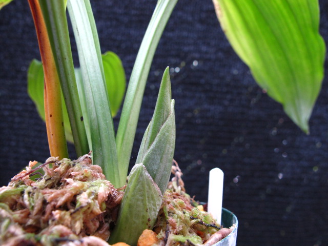 やや早めの株:3枚目の子葉鞘が伸びてきています(開花40日前くらい?)