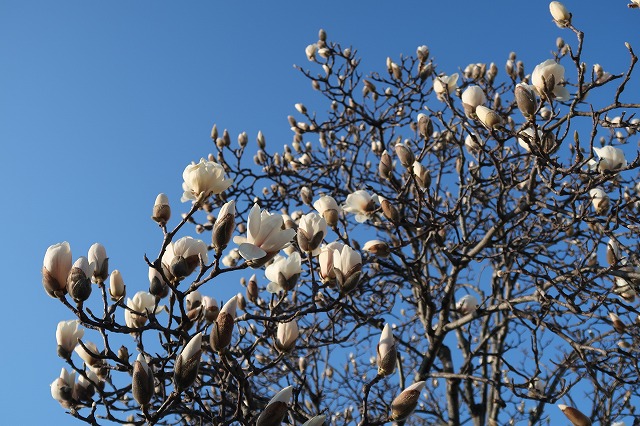 ハクモクレンが咲き出した。ほぼ平年並みだが勢いが鈍い感じ。