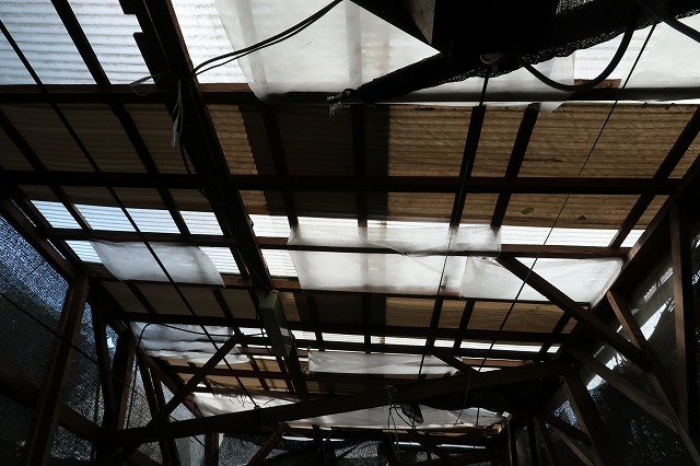 小屋の屋根 ポリカや畜産波板、寒冷紗、不織布などで複雑に(切った張った状態)調整。
