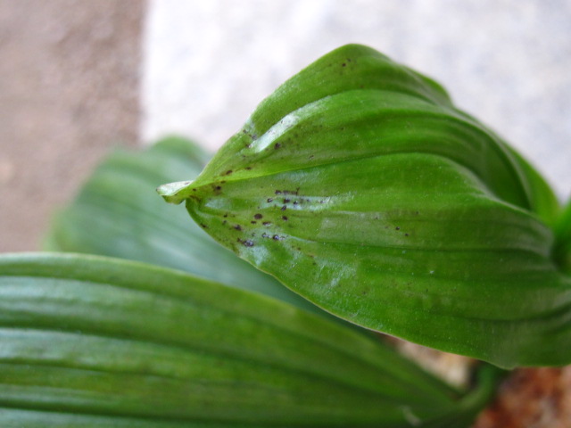 エビネの新葉がどんどん伸びる今頃、ニオイエビネの葉先にこのような黒点が出ることがあります。葉先の方1/3くらいのところまでに出やすいようです。