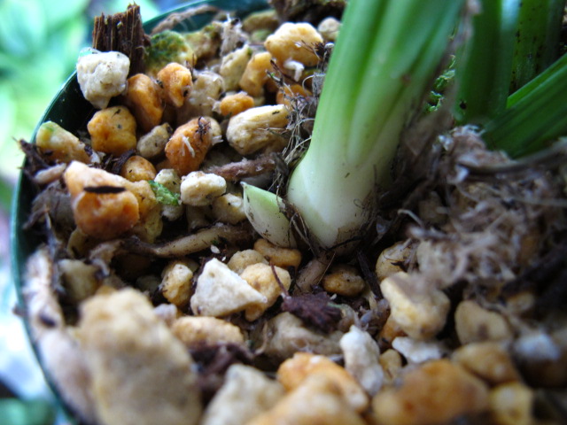 新芽はこれからですが、未開花交配苗の新芽が伸びてきていた。うれしいですね!