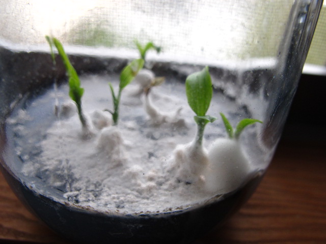 培養中のビン 知らぬうちに大カビが発生。でも生きていますね。植え出してみるかな
