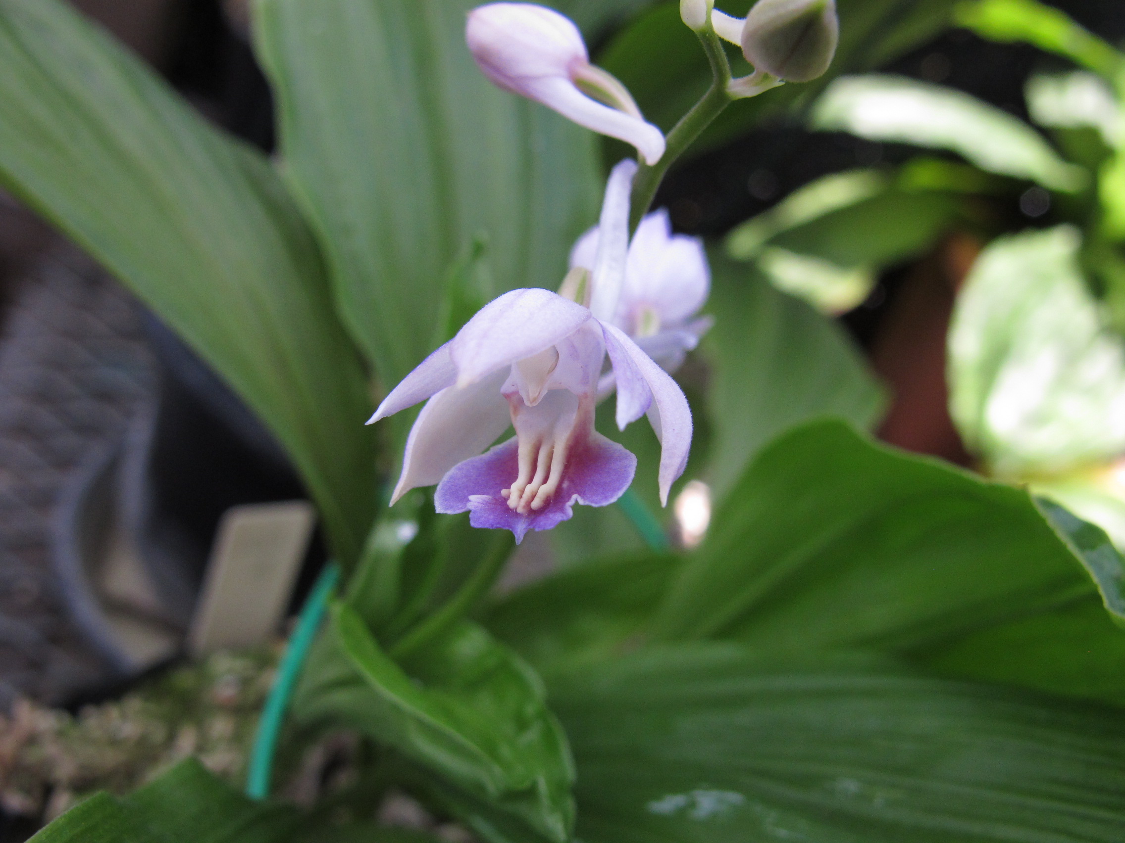 左の花はキリシマエビネ白花大輪で、舌に黄が乗る(キリシマ全般にあり)以外、紫の色彩はありません。距、舌の形や咲き方からヒゴとは違うように思います。入手先の鹿児島の業者さん(かなり以前、高齢で廃業)から、「あれだけのキリシマは二度とない。増えているのなら株を戻してほしい。」といわれた優秀株です。