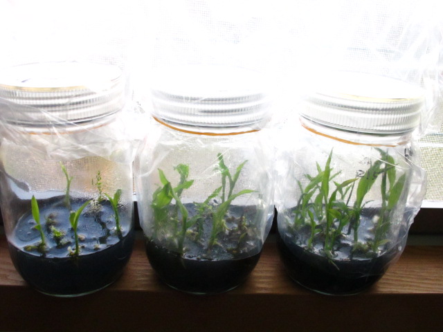 少し時間のかかる方法ですが、大したテクニック、大した設備なし(簡易なクリーンベンチのような移植空間は必須でしょうね)でこの程度の苗はできます。時間のかかるというところがミソかもね。種明かしをすればアホらしいので・・・でも植え出しの苗にするまではなかなかたいへんなんですよ~~ このあと植え出してからしばらくの生育が勝負ですね~~