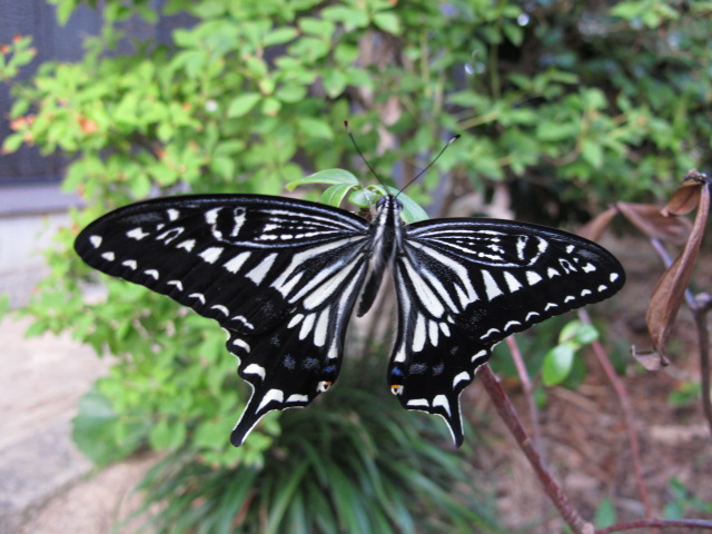 今朝、新聞を取りに出たら羽化して間もない小さいアゲハがいました。