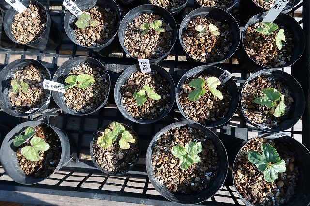 今年もアサガオの栽培をしています。東京の研究会から送られてきた種子を10日ほど前に播いて、芽が出たので小鉢へ移植したところ。