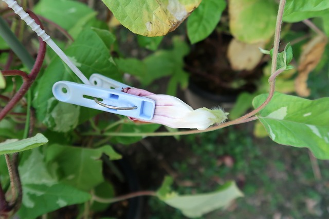 開花前日に洗濯ばさみやクリップで蕾をはさんで開いてしまわないようにして自家受粉させている。