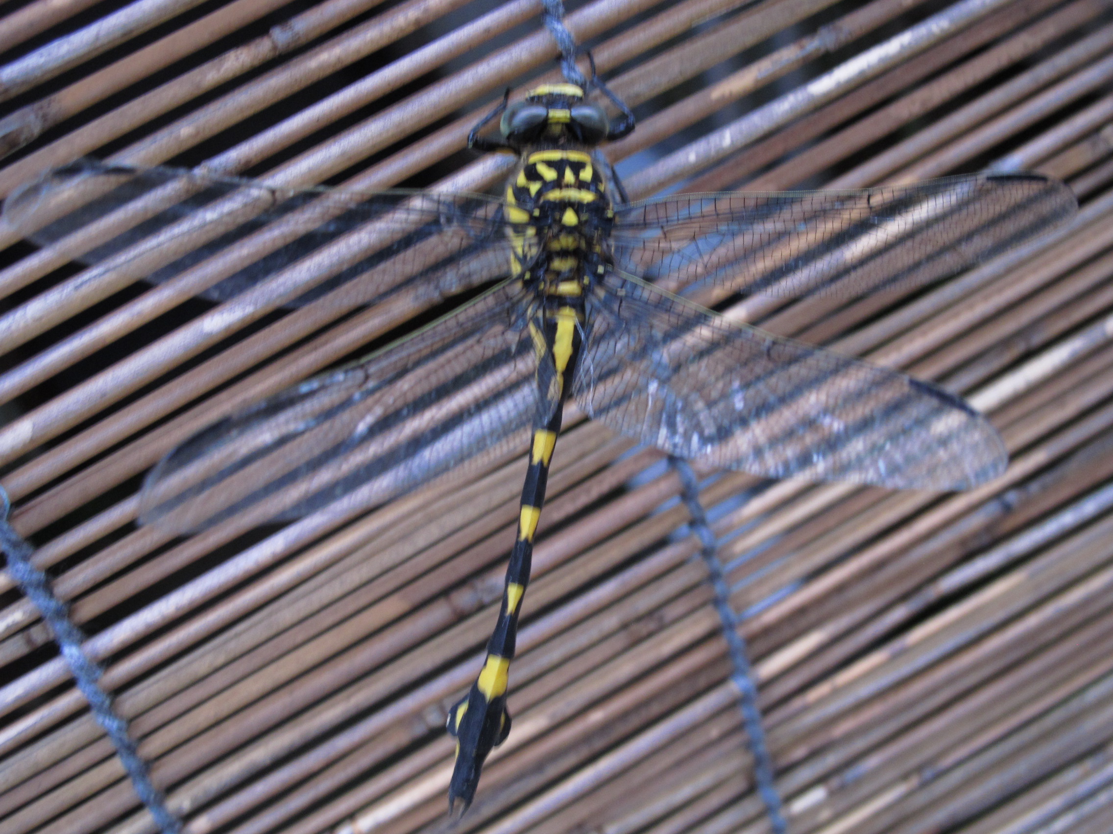 早朝外に出たら、すだれにウチワヤンマ(♀)がいましたが様子が変。近づいても逃げません。