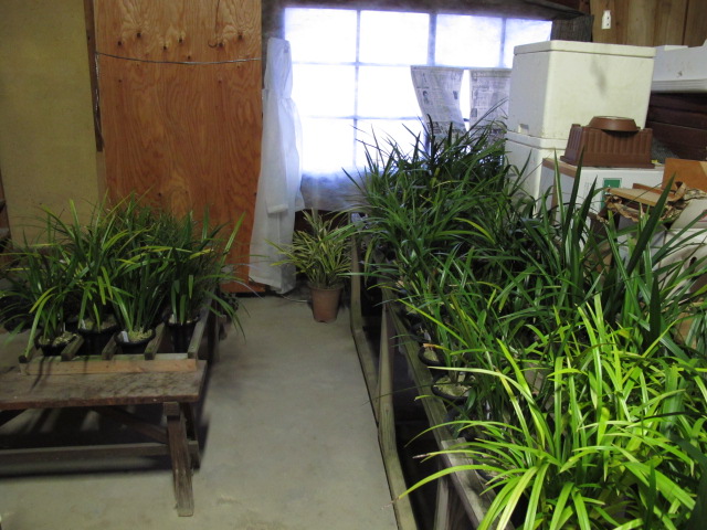 倉庫内の寒蘭。 反対側にはエビネも置いてあります。
