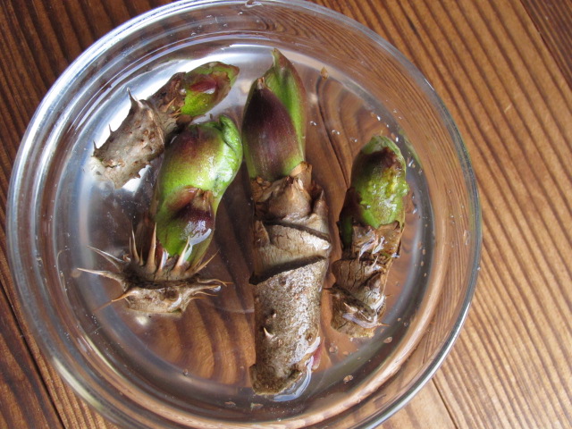 小さい若芽を少し残して、水につけて開かせています(こんなやり方するのかなあ)。