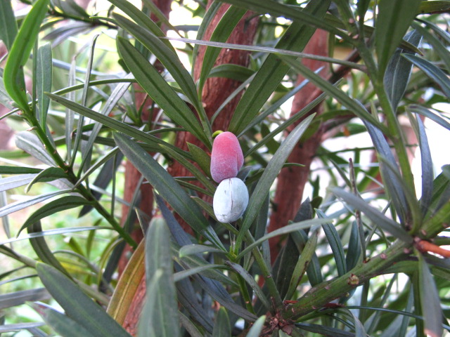 マキの木の実。この実は熟れて赤いが、ふつうは黒い。小さいころ食べたことがありほのかに甘い。下の緑の方が本当の実でこれは食べないが植えておくと芽が出ることがある。