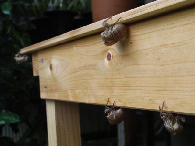 庭のキンモクセイのそばに5月に作った木製の台が置いてありますが、穴ゼミ(羽化前の殻を被ったセミ)がどういうわけかキンモクセイに上らず,この台にばかり上って羽化しているようです。
