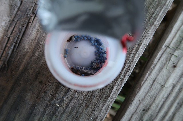 ワナのヤクルト容器  中に誘引剤が入っている。置くときに雨が入らないように傾けてフタをわずかだけあけておく。