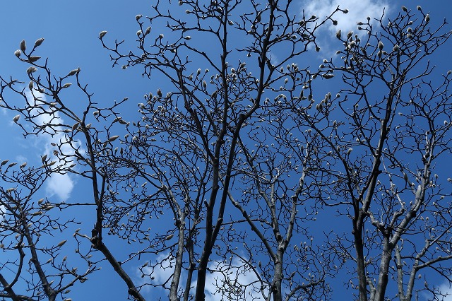 庭のハクモクレンが白い花びらを開こうとしている。ちょっと開花がバラついている感じ。
