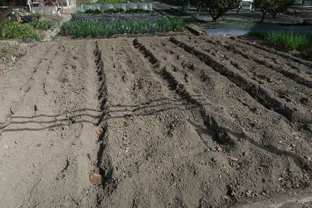 この後、畝を整形して、黒マルチをかける。