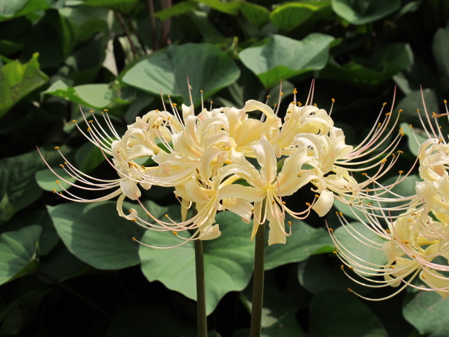 毎年、秋の彼岸ごろ、紅白ほとんど同時期に咲きます。花期は短く、花後すぐに葉が出てきて冬の間中茂っています。