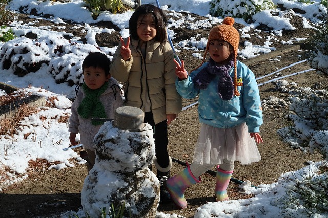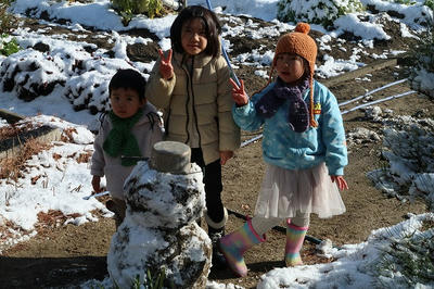 孫たちは大喜びで雪だるまを作っていた。雪が少ないので泥団子のような雪だるま・・・