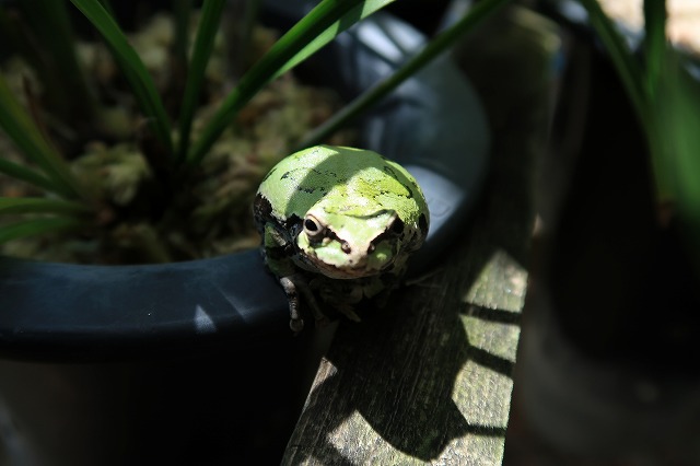 春蘭の鉢のところにアマガエルのケロちゃんがいた。かわいいがよく太って貫禄がついている。