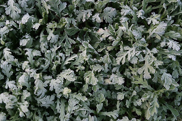 菜園のシュンギクも霜で白くなった。