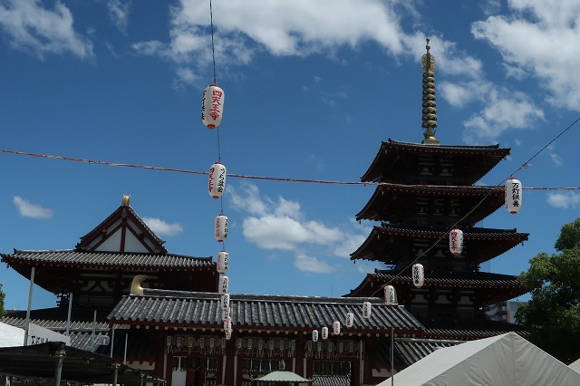 墓の一つがある四天王寺(聖徳太子の創建)。 お盆でたくさんの提灯が揺れていました。
