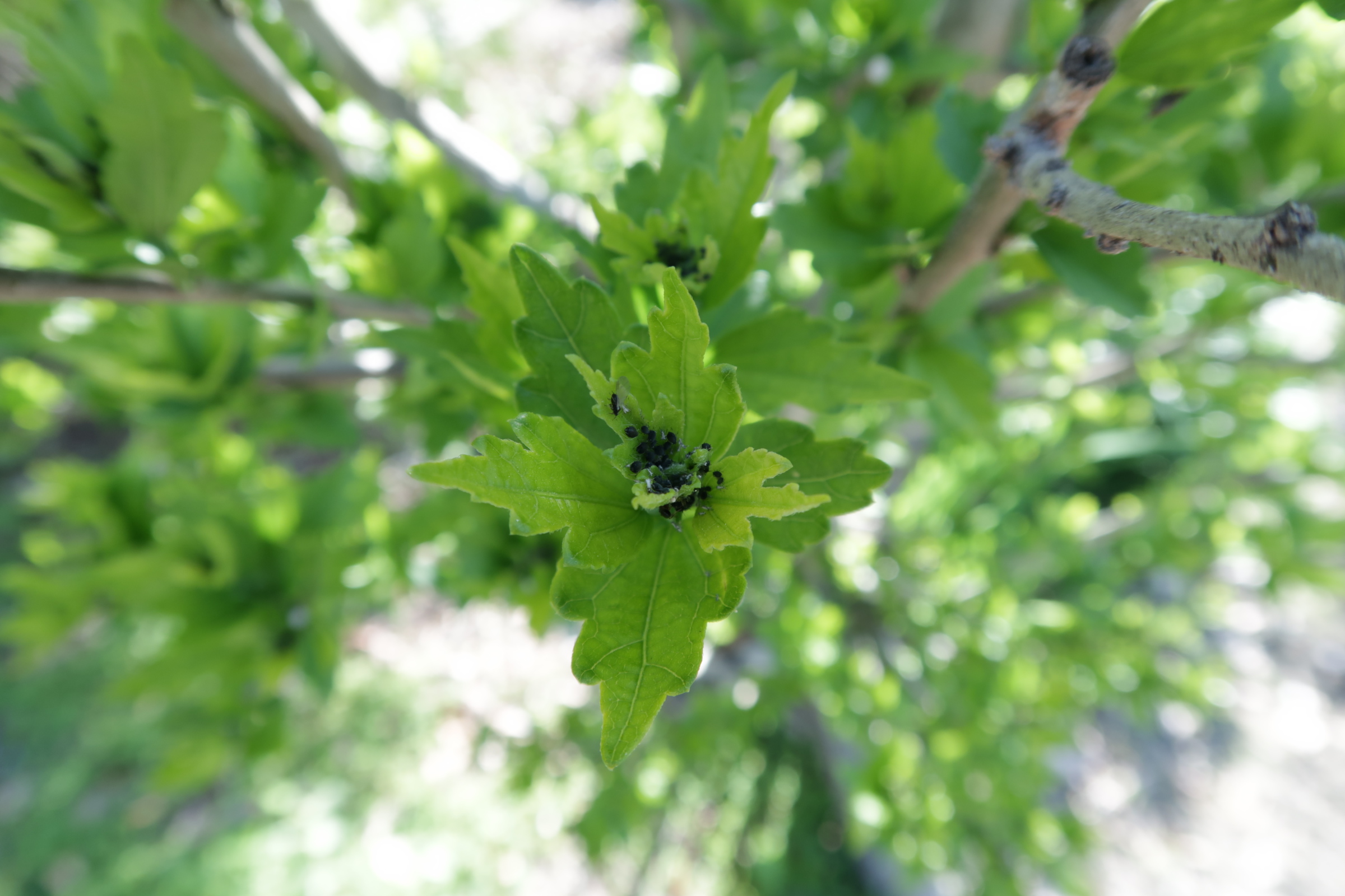 ムクゲの葉にアブラムシがたかり始めました。アブラムシはこの木とカエデに真っ先にやってきます。