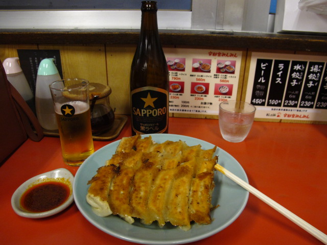 気を取り直してすぐ近くの「みんみん」に行ったら10人ほどの行列。並んで待つのは私の流儀ではないのですが、ここまで来て短気は起こさず、じっと我慢して10分くらいで入店。焼き餃子3つとビール。ラー油多い目でたれを作ってパクッ!