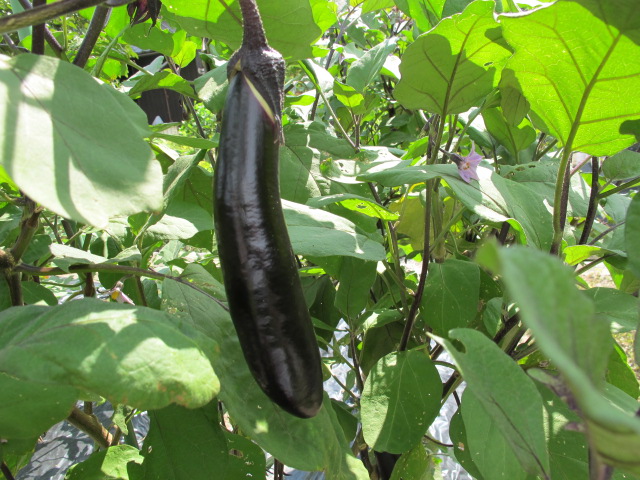 今年のなすは病害虫が少なく、今でもきれいにできています(画像)。これは中長なすですが、このなすの隣に庄屋大長なすがあり、大きくなれば50cmくらいになります。きめが細かく種が少なく味もいいです。直売所以外では見かけませんが、これがなすの中ではでは一番おいしい。
