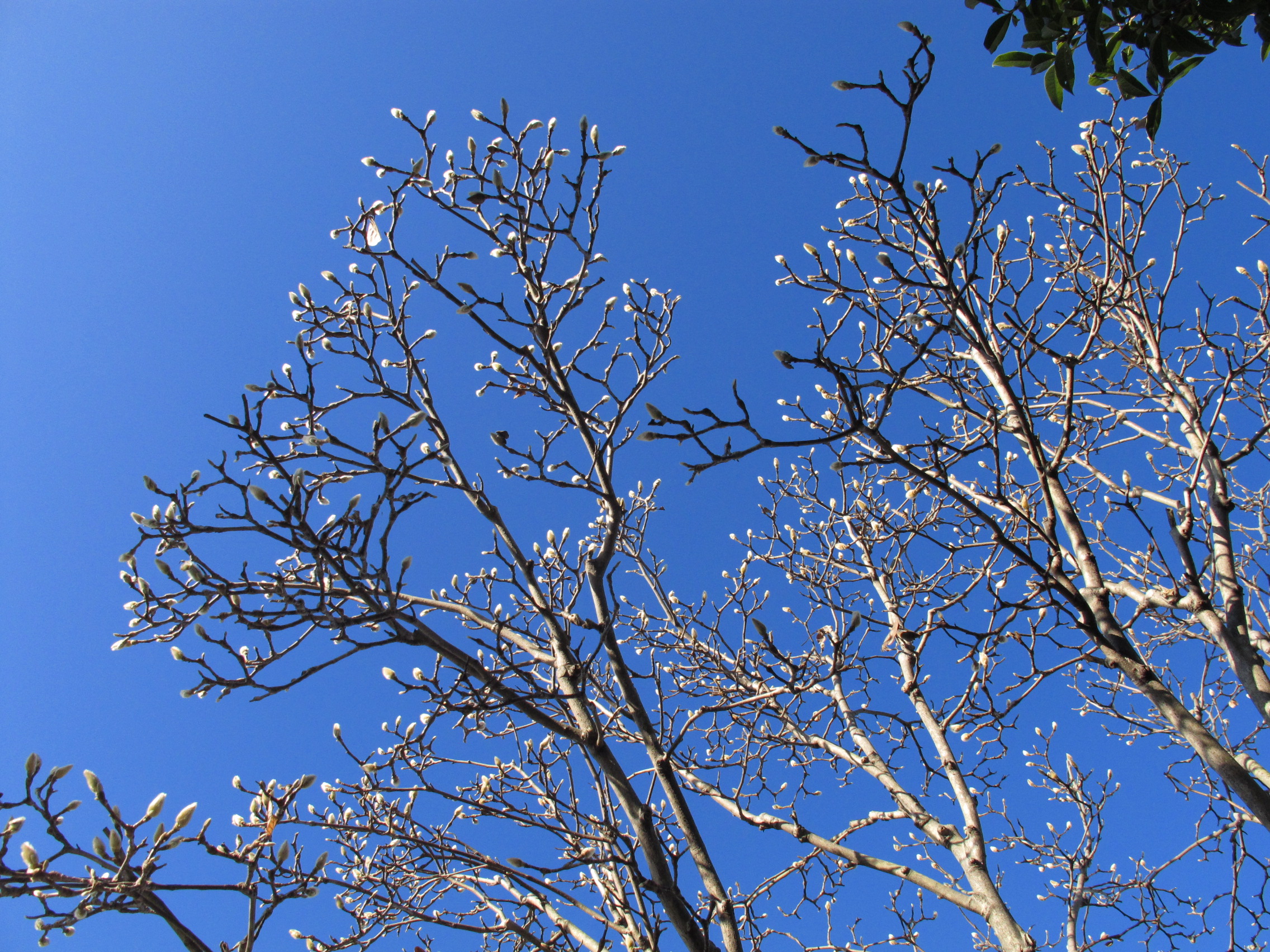 澄み切った空、寒風の中でに耐えるハクモクレン。