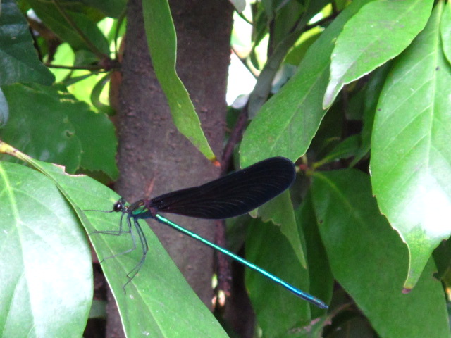 エビネ小屋の横の狭い通路にハグロトンボがいました。腹がきれいな金青緑色です。