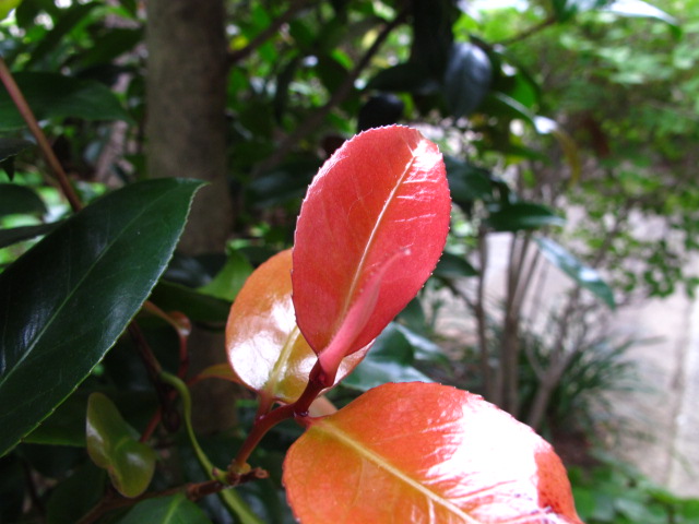 ツバキはほとんど自家受粉しないので雄親は不明。このツバキ、新芽が濃い紅色になったりこのように明るい朱色になったり七色に変化してきれいです。花も大洲黒ヤブ似の暗紅色で良いです。