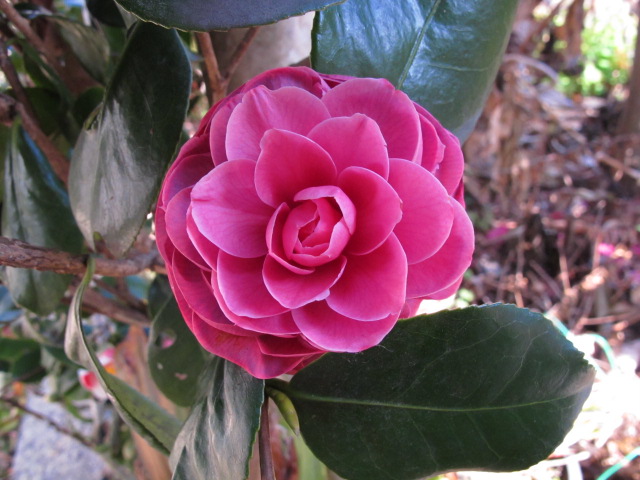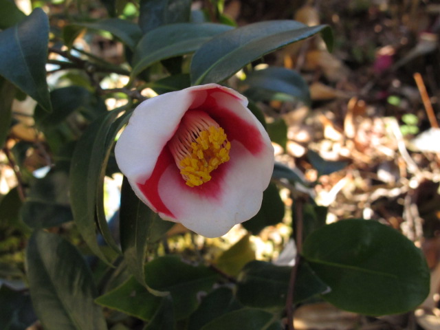ヤブツバキ「玉の浦」 寒い時期に咲くと深い覆輪が冴えますが、チョット深すぎますね。
