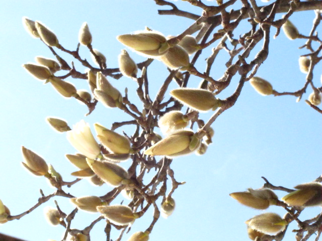 ハクモクレンも蕾から白い花弁が見え出してきました。一部では咲きかけのものもあります。