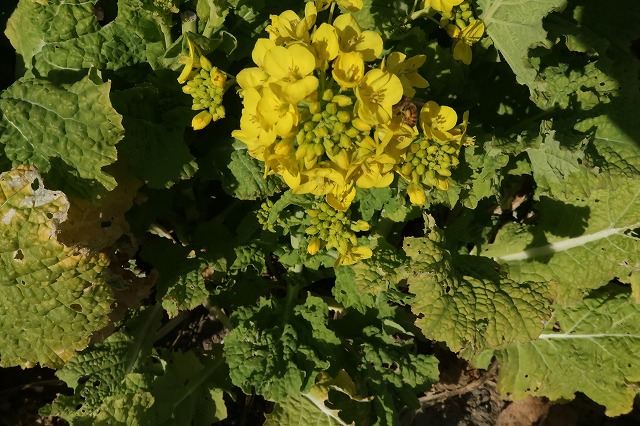菜の花 我が家の食用のナバナでだいぶ前から咲いている。もうミツバチが来ている。