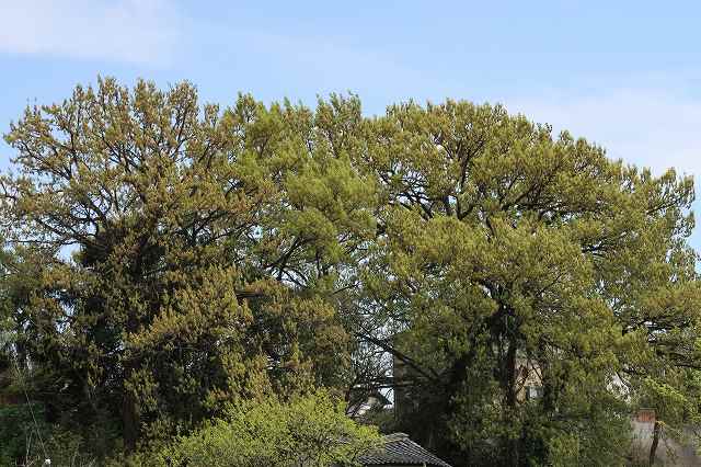 近くの小山の木がいっせいに芽吹いてきた。この木は毎年カラスが巣をして子育てをする。