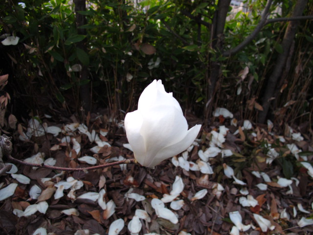 ハクモクレンも終わり際、はらはらと花弁が落ちてゆきます。遅れ花一輪、別れを惜しむ。