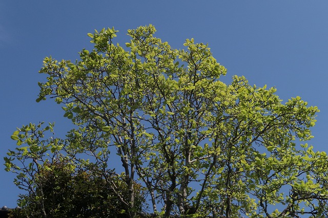 開花からひと月近く、ハクモクレンの新緑が春風にそよいでいます。