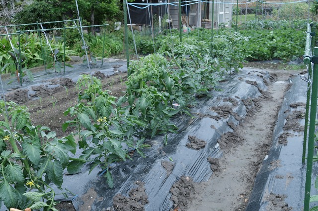 トマトは支柱を立てて誘引したところで、ここからしっかり陽にあたって育つところでしたが、雨に打たれてびしょびしょになっています。日照不足になると着果が悪くなったり病気が出やすくなるので困ります。前作の野菜の肥料が残っているのかちょっと肥料が効き過ぎです。