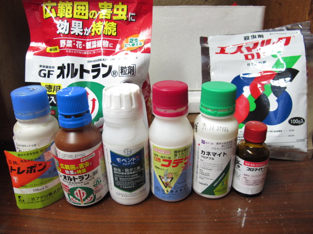 オルトラン:浸透移行性のある薬剤。庭木のドクガ退治などに使用。粒剤、水和剤、液剤あり