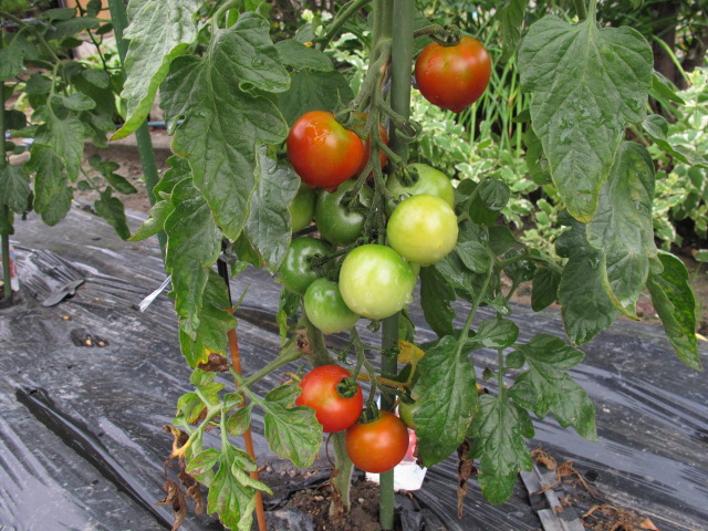 中玉トマトの1段目花房の実が赤くなってきました。収穫の始まりです。