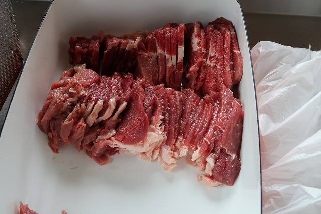カミさんが切っていたが良い肉だ。猪肉は炊きすぎても硬くならないのでいい。