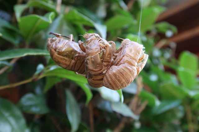 庭のキンモクセイの葉先に3匹が重なった空蝉があった。いくらでも羽化できるところがあるのに、なぜかこんなことになっている。何か原因がありそう。毎年よく似た空蝉団子を見るなあ。