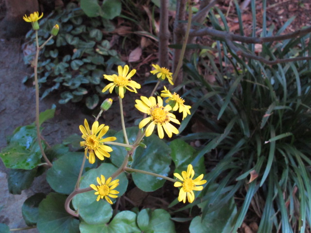 ツワフキの花 キク科なんですね.。後ろにカンアオイが見えます。