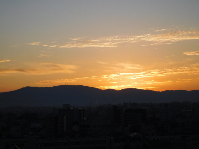 久々に見る生駒山の朝  この右側に金剛山が連なっています。北西の方を見れば六甲山。