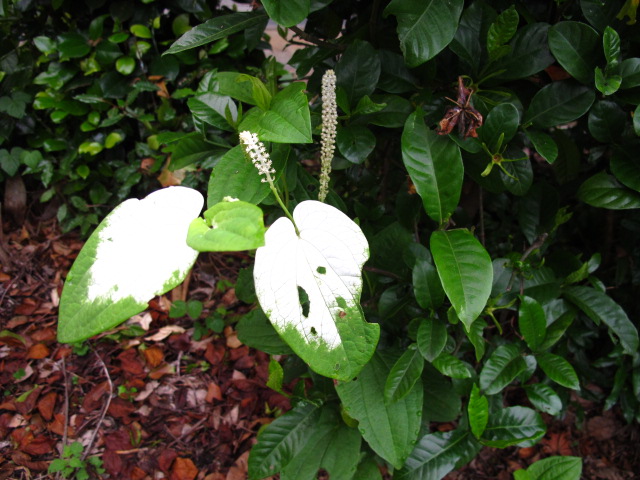 庭に生えているハンゲショウ 夏至の頃になるとこのように葉が白くなります。