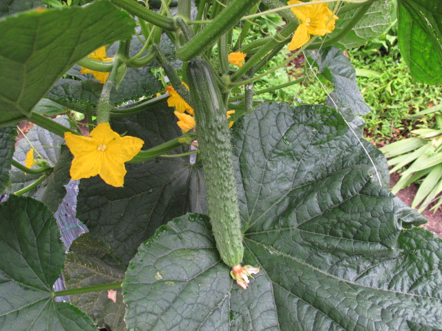 キュウリ 次々に実が成ってきました。食べる量に併せて摘果します。